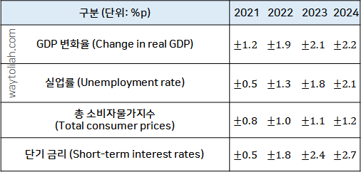 * 신뢰 구간은 해당 연도 4분기 단기 금리 평균 수준 기반으로 측정되었습니다. 신뢰구간/예측오차 범위에 대한 자세한 정보는 표2에서 확인할 수 있습니다. 신뢰 구간이 0에서 잘린 경우 녹색구간이 70% 범위가 아닐 수도 있습니다.