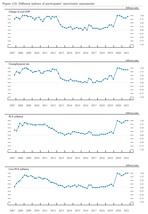 참고: 매년 9월, FOMC 멤버들은 "지난 20년 동안 불확실성 수준과 귀하가 예측한 수치의 불확실성에 대해 판단하여 표시해주십시오"라는 질문에 매년 답변을 기재했습니다. 각 지표의 경기동향지수(diffusion index)는 "더 높음(Higher)"이라고 응답한 멤버수에서 "더 낮음(Lower)"이라고 응답한 멤버 수를 뺀 후, 전체 멤버 수로 나눈 값을 나타냅니다. "즉, ('더 높음' 응답자 수 - '더 낮음' 응답자수) ÷ 전체 멤버 수". 예측치가 없었던 2020년 3월은 제외되었습니다.