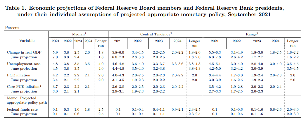 Table 1. Economic projections of Federal Reserve Board members and Federal Reserve Bank presidents, under their individual assumptions of projected appropriate monetary policy, September 2021