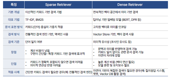 - EnsembleRetriever: 여러 개의 리트리버를 조합하여 검색 성능을 향상시키는 리트리버