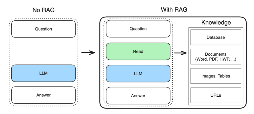 : 기존의 LLM 답변 생성하는 과정에 검색을 추가하여 답변에 참고할만한 정보 제공