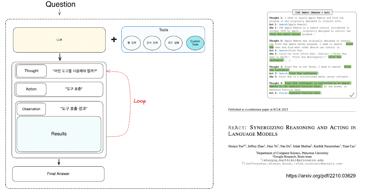 | 외부 지식 획득 | 학습 데이터에 한정됨 | 웹 검색, SQL 등 외부 도구로 지식 확장 |