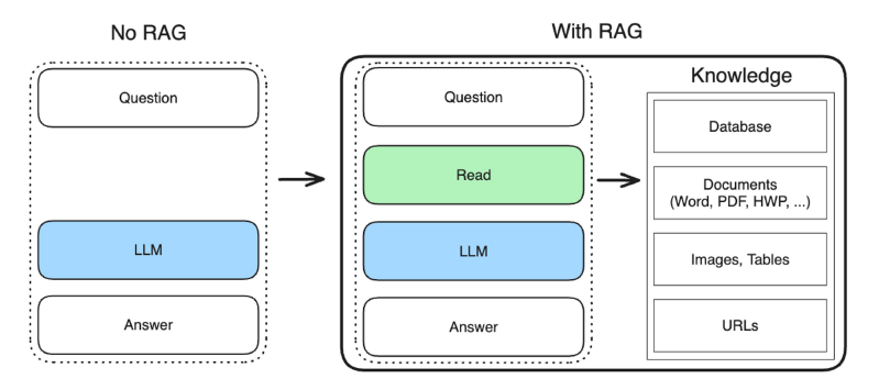 - 기존의 LLM 답변 생성하는 과정에 검색을 추가하여 답변에 참고할만한 정보를 제공