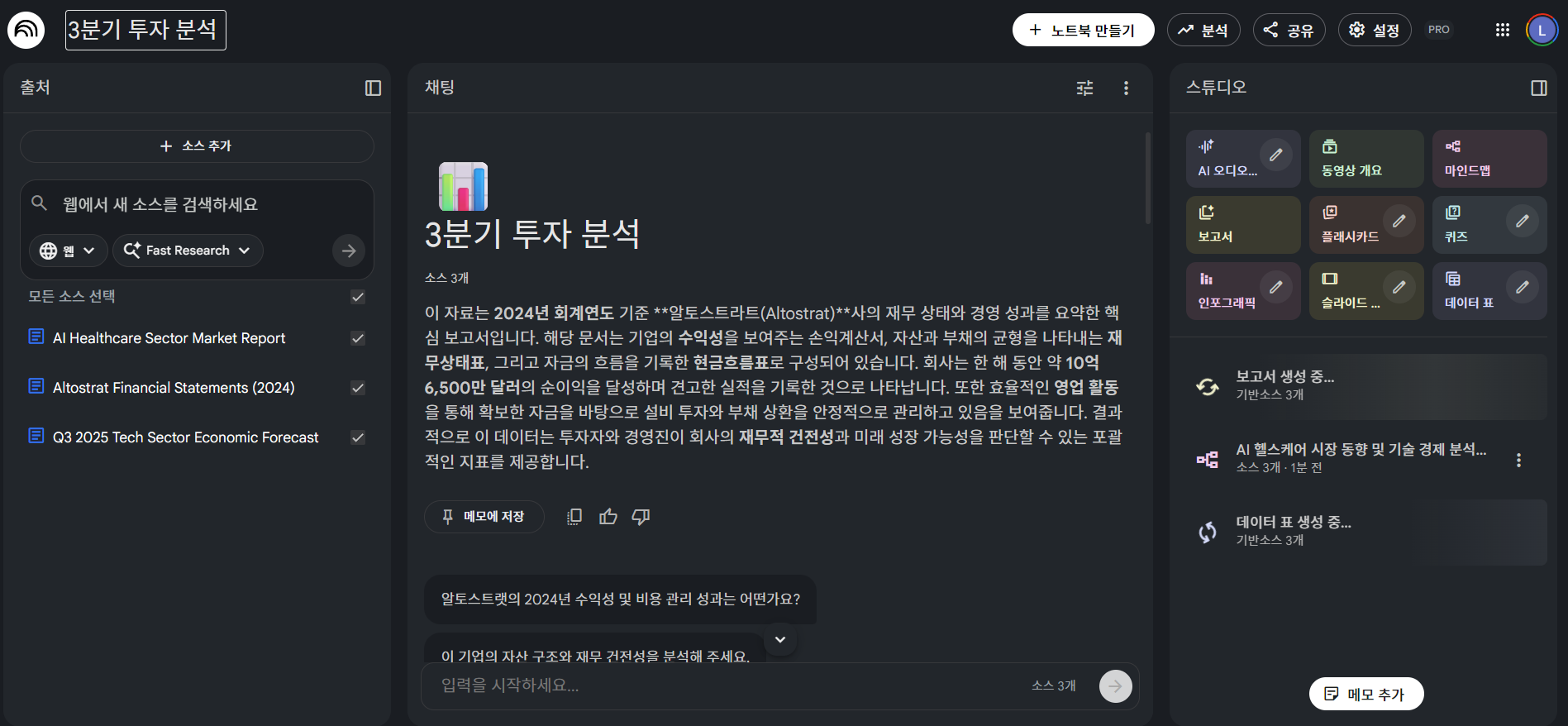 - 관찰: NotebookLM은 여러 시장 보고서와 경쟁사 분석을 연결하여 잠재적인 패턴이나 위험을 강조. 다양한 문서에서 '점들을 연결'하는 능력이 큰 장점.